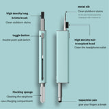 Once upon a time, in a world where cleanliness and functionality reign supreme, there existed an extraordinary 5 In 1 Wireless Earphone Cleaning Kit that had the power to transform your everyday cleaning routine. With its multifunctional design and innovative features, this kit was like no other. Its flocking sponge delicately wiped away dirt and grime while its high-density brush effortlessly removed stubborn debris. The metal tip ensured precision cleaning in hard-to-reach areas with ease. But what set this kit apart from the rest was its retractable design and hidden double-head feature, making it compact yet incredibly versatile. No longer would you struggle with tangled wires or misplaced accessories because the sliding switch flawlessly switched between brush and nib functions for all your cleaning needs. The flocking sponge stick gently swept away smudges on touch screens using the capacitive pen's exclusive design with an electroplated metal layer for durability. Constructed from ABS material along with a sturdy metal nib, this kit was built to last without compromising on performance. Its high-density hair-planting head offered just the right balance of hardness and elasticity, ensuring thorough yet gentle cleansing without any friction-induced damage to your equipment. Imagine effortlessly revitalizing not only your earphones but also keyboards and Bluetooth-compatible wireless heads in one fell swoop! This remarkable kit catered to every meticulous detail of cleanliness you desired – leaving no corner untouched by its superior cleaning ability. With its compact design that fit snugly into any pocket or bag, carrying this essential companion wherever you went became second nature. So why settle for anything less when you can elevate your cleaning game? It's time to embrace excellence in maintaining hygiene by experiencing firsthand the prowess of our exceptional 5 In 1 Wireless Earphone Cleaning Kit - because achieving spotless perfection has never been so effortless!