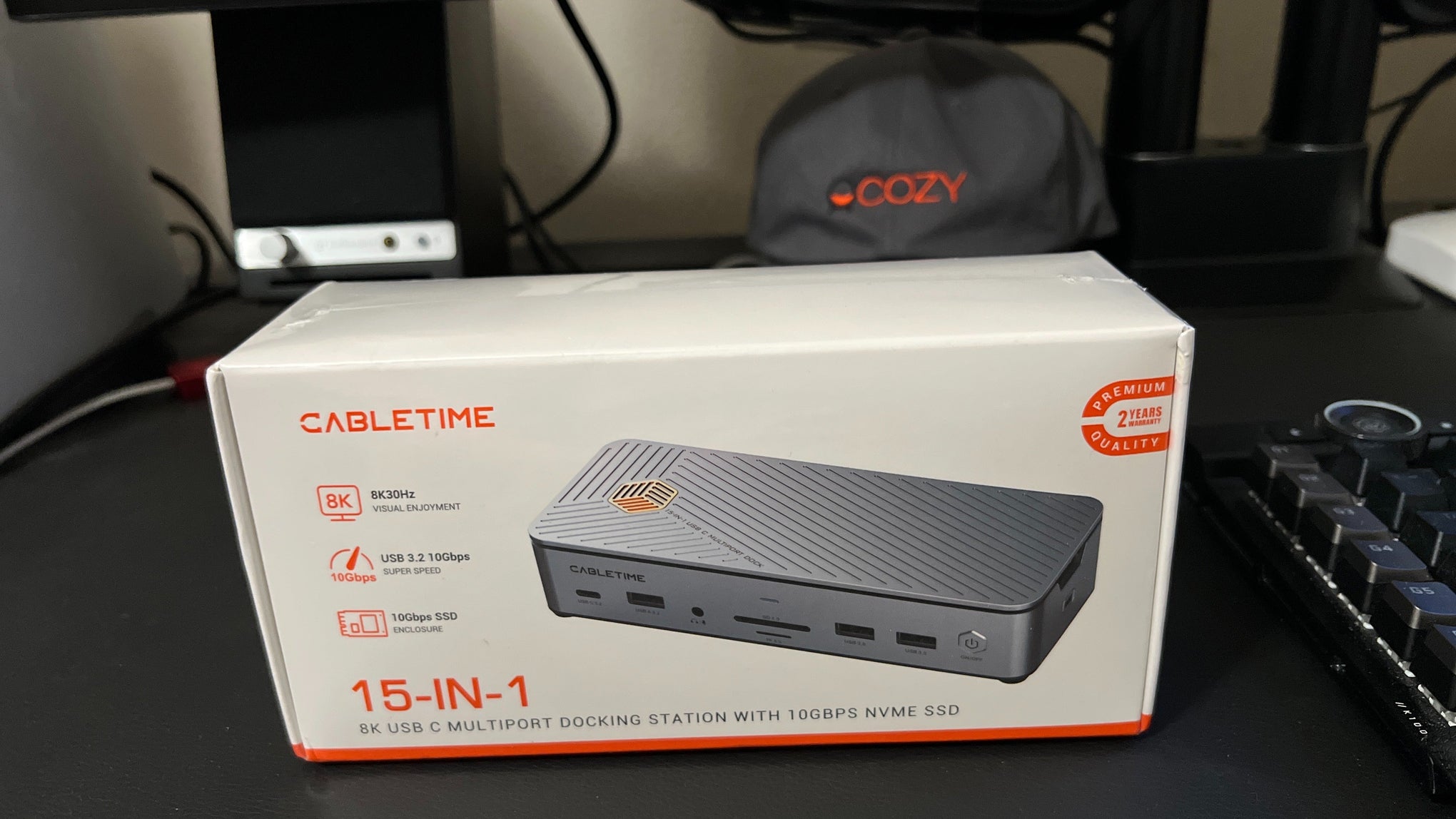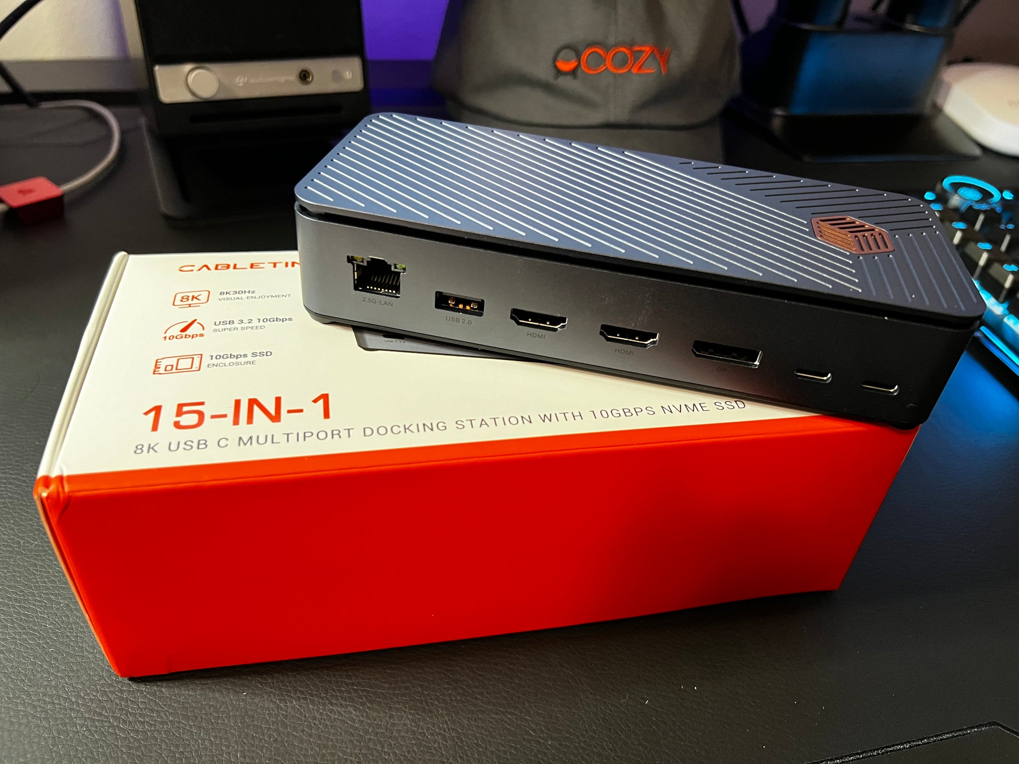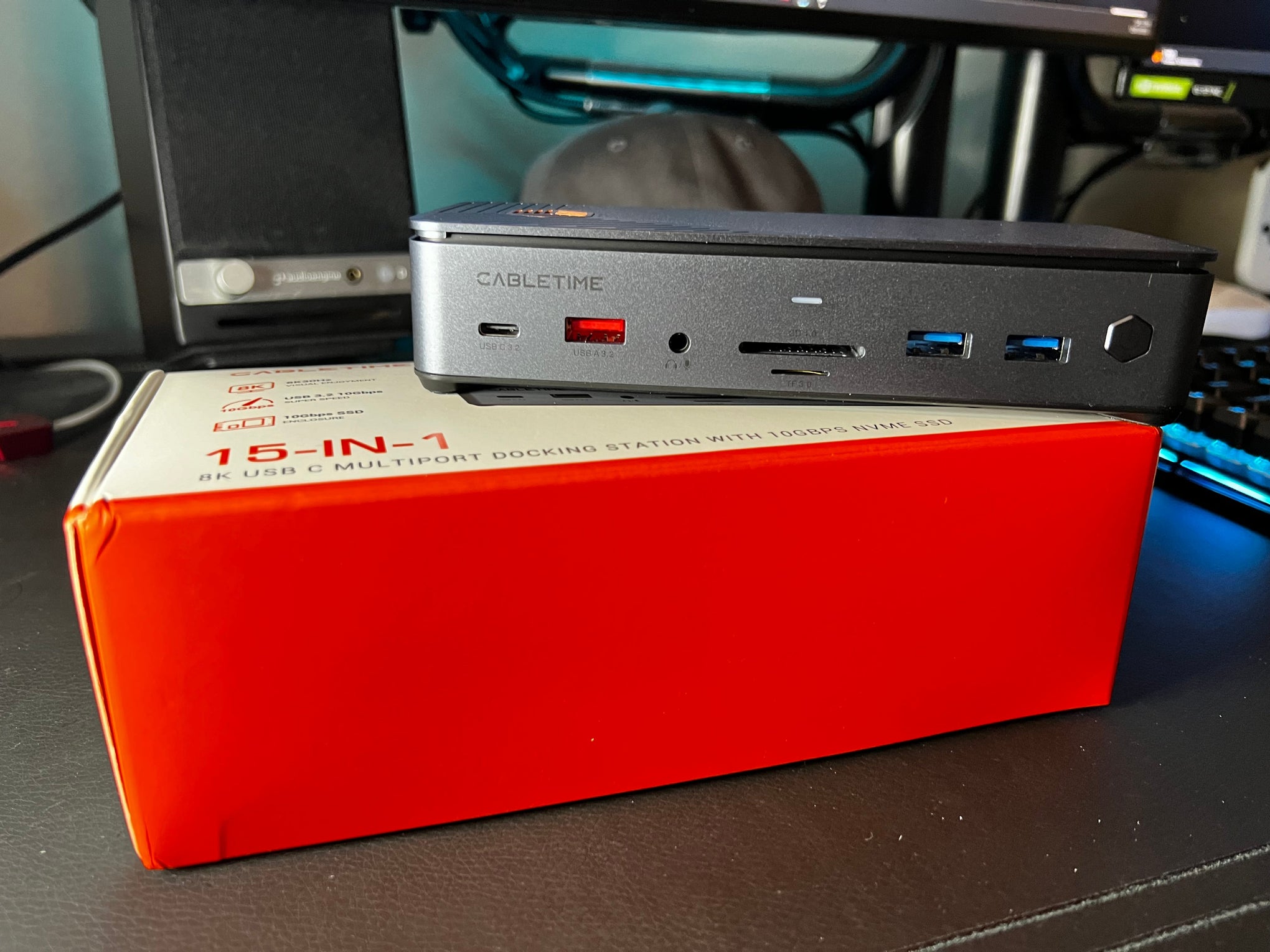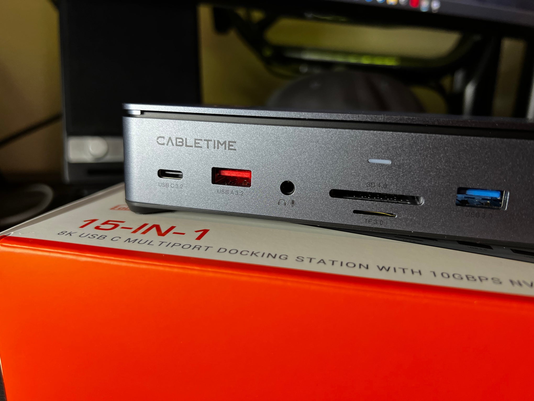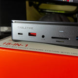 CABLETIME 8K 15 in 1 Docking Station has 15 ports for convenient connection to HDMI, USB C, USB, Ethernet, SD Card Slot, Micro SD Card Slot, and Display Port. It supports 100W power delivery for fast charging. The two versions, with and without an SSD enclosure, make it perfect for the modern user. With a Velcro strip for easy cable management, it's the perfect way to connect multiple monitors, keyboard, mouse, and other peripherals with a single USB-C connector.